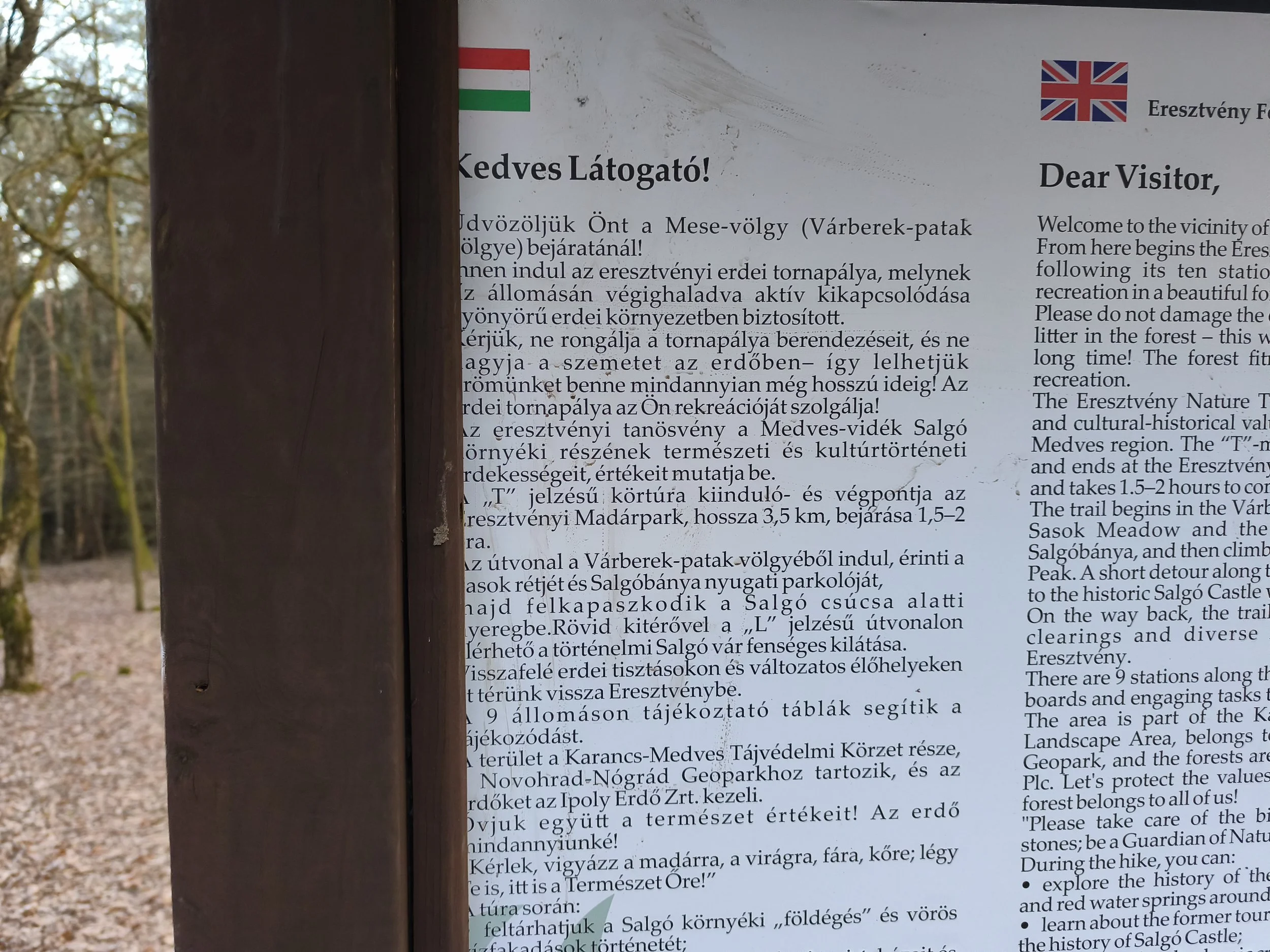 Javított tábla, kicsit jobb margókkal, de azért illett volna átírni a szöveget, ugyanis a Salgó-nyeregben vagyunk valójában, mégis ezzel a mondattal kezdődik: Üdvözöljük Önt a Mese-völgy (Várberek-patak völgye) bejáratánál. Nem, ez nem ez a helyszín!
