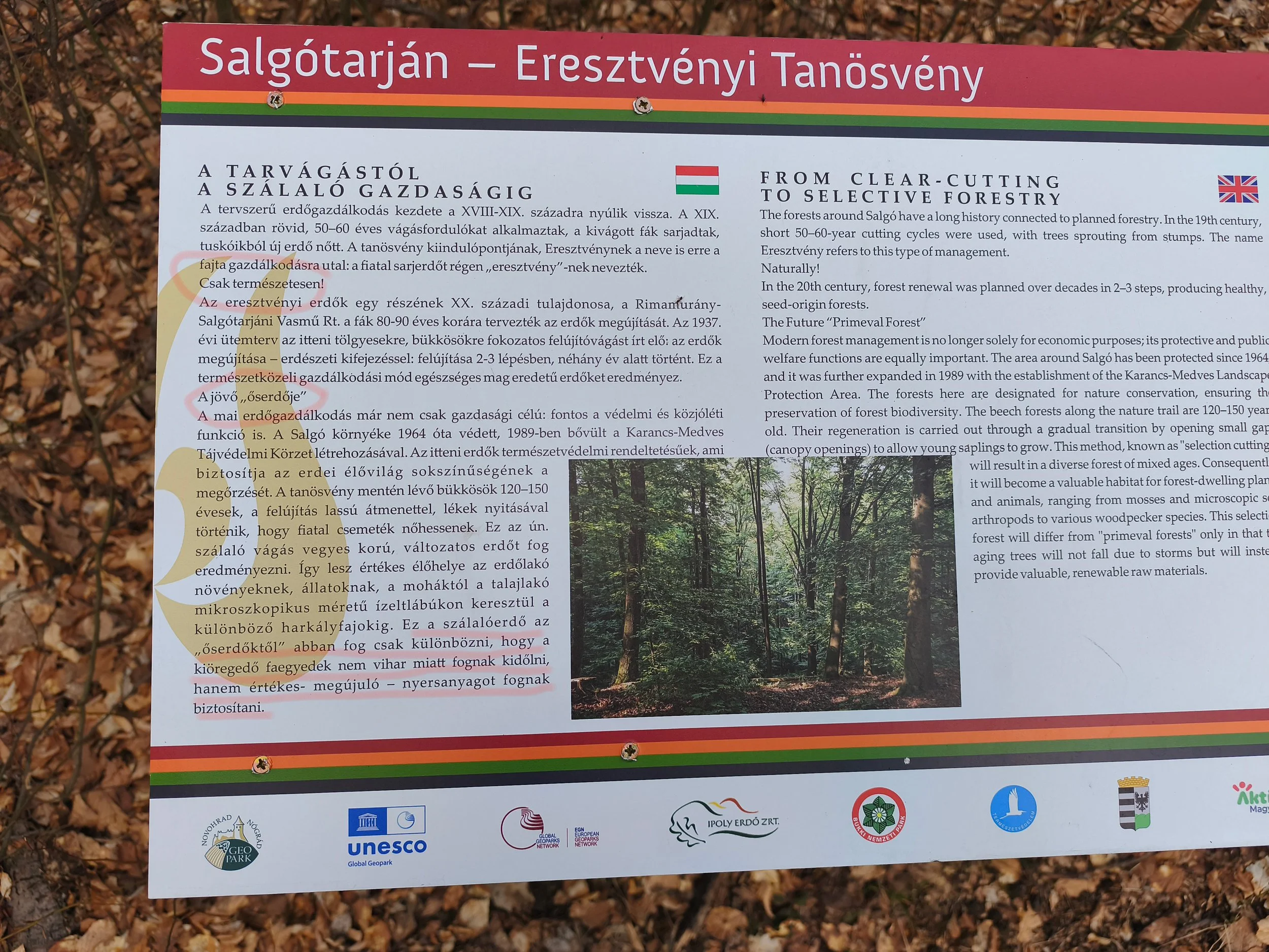 Szerintem az ismeretterjesztő tábláknak szinte kizárólag az erdei életközösség bemutatását, az erdők védelmét kellene ezen a helyszínen tartalmazniuk, és nem a gazdálkodás magyarázatát. Nem is beszélve arról, hogy amit látunk, az nem nevezhető szálalásnak, de léknek is nagy. Egy lék kb. max. 30x50 méter, de védett területen, illetve ilyen fontos turisztikai térségben illene ennél kisebb lékeket alkalmazni. Amit ennél a táblánál látunk az erdőben, az nem lék, szerintem. Több.